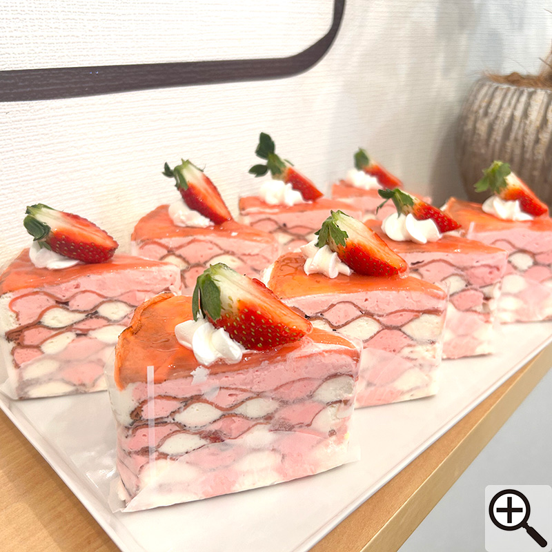 小麦粉(国内製造)、鶏卵、バター、砂糖、サラダ油、生クリーム、いちご、ゼラチン、いちごピューレ/香料、着色料(赤色3号)(一部に小麦・卵・乳成分を含む)